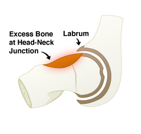 The femoral head is attached to the lower femur by the femoral neck. The transition between the head and neck is often referred to as the head-neck junction. It is important to have a femoral head that is round and much larger than the femoral neck supporting it. This difference in size (diameter) is called the head-neck ratio. The larger the ratio, or difference between the head and neck, the more motion available to the hip before the bone at the head-neck junction contacts the bone at the rim, or edge, of the acetabulum. If excess bone develops at the head-neck junction, the ratio between the head and neck is decreased and contact between the ball and socket occurs much earlier in motion. This early contact is often referred to as hip impingement. Early contact can also occur due to increased bone at the edge of the socket, a deep socket or a poorly positioned socket.